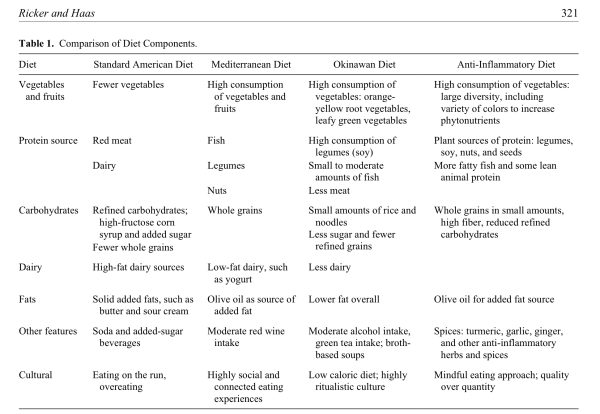 Complessivamente quello che si può vedere dalla tabella, tratta dalle linee guida ASPEN (Socitetà Americana per la Nutrizione Parenterale ed Enterale), è che il “modello anti-infiammatorio” si basa su un misto di queste due diete, come già anticipato nel paragrafo precedente. In particolare le caratteristiche di tale regime alimentare sono: